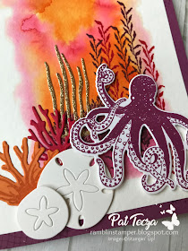 Because watercolor paper is stiffer & heavier than cardstock, I adhered it to the card base with Tear & Tape adhesive.  The other die-cut elements are adhered with Liquid Multipurpose Glue, with the exception of the octopus and the small sand dollar, which are raised up with Mini Stampin' Dimensionals.